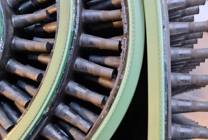 Der große Vorteil eines Kegelbands ist, dass es sich besonders für härtere Bedingungen eignet, z. B. für das Auffangen von Steinen und harten Klumpen, die sich in den Pflanzen befinden. Das wird durch die Dicke der Kegel und durch die Form ermöglicht, denn die Unterseite verläuft konisch, wodurch Abbrechen oder Abreißen verhindert wird. Die Produkte fallen sauber vom Band und die Blätter und der Schmutz bleiben zwischen den Kegeln hängen und werden am Ende des Bands mithilfe eines Kamms entfernt.